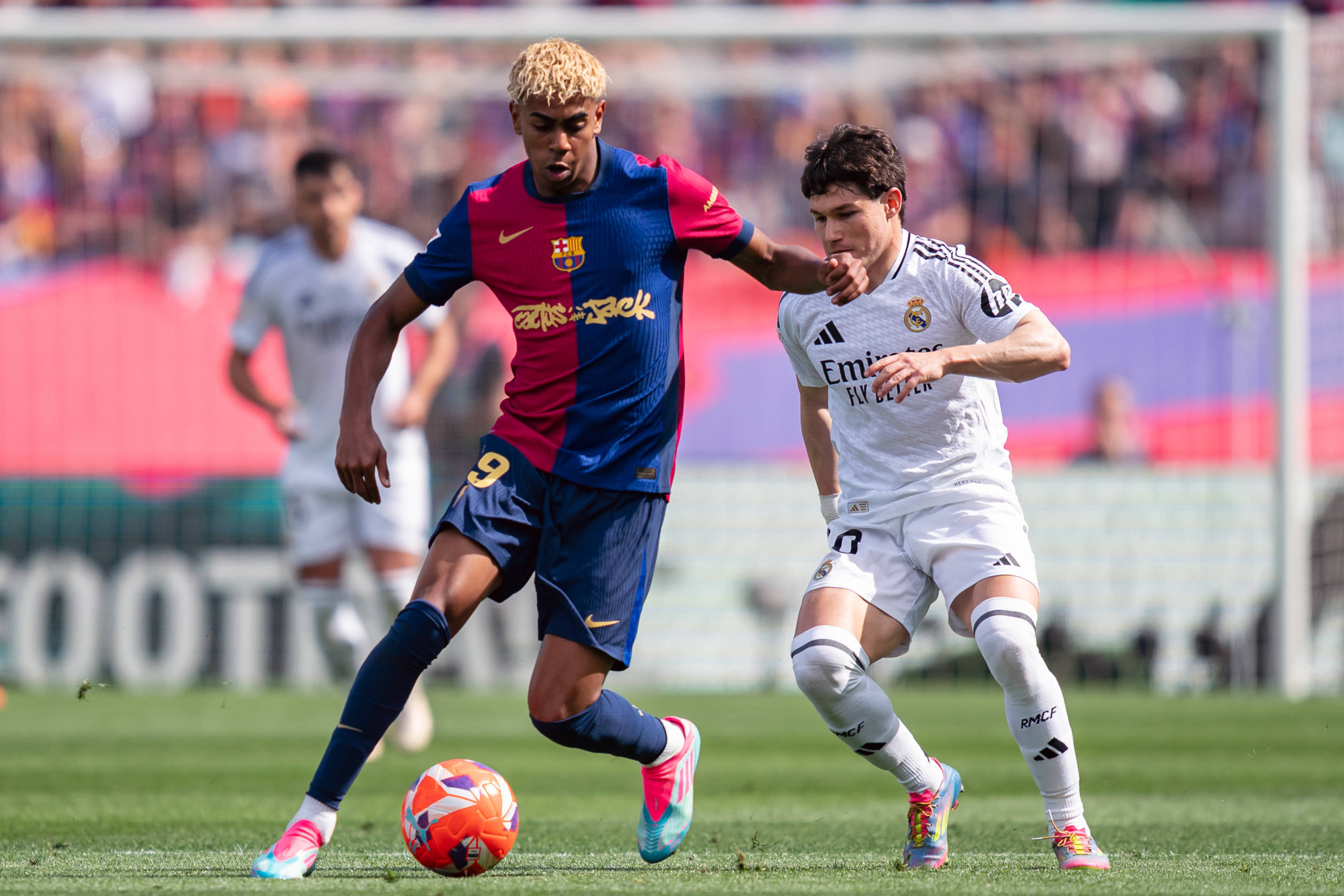 5月11日,巴塞罗那队球员亚马尔(前左)和皇家马德里队球员弗兰·加西亚在比赛中拼抢。新华社发(胡安·戈萨摄)巴萨尔后不绝猛攻,皇马后防地在第45分钟出现伪善,拉菲尼亚收拢契机再进一球,半场边界巴萨4:2跨越。