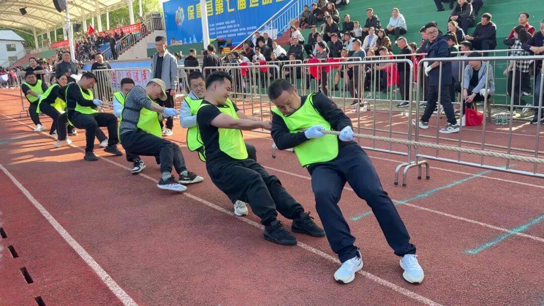 在拔河比赛现场,队员们紧持长绳、都声高唱,红线在对抗间往来出动,较量强烈。